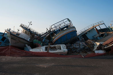 So we see images of men and women walking deserts, gathering hopeful and trembling, gathered in prayer, caught in the longing of nostalgia or in the awareness of having to entrust the success of their lives to others. And then heaps of barges in dry, vectors of a crossing on the danger to lie exhausted like dead bodies.